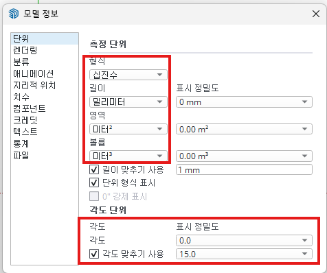 창(w) > 모델정보 > 단위 탭
